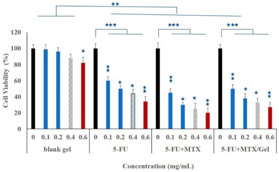 Cytotoxicity studies of 5-FU-loaded hydrogel, as a function of concentration, on breast cancer MCF-7 cell membranes. The results were illustrated in comparison with either unmedicated hydrogel (blank gel) or free drugs solution after incubation with MCF-7 cell for 24 h. The results are shown as mean (n = 3) ± standard deviation. ⋆ p < 0.05, ⋆⋆ p < 0.01, and ⋆⋆⋆ p < 0.001 for significant, highly significant, and very highly significant, respectively. Unpaired Student’s t-test.