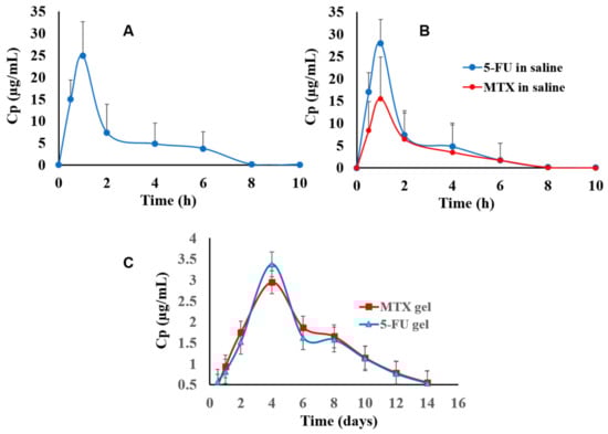 The concentrations of 5-FU and MTX in different rats’ plasma samples (n = 6) were calculated from the corresponding calibration curves equation, developed in the above HPLC method. The plasma concentration-time (Cp/) curve of 5FU/MTX (plasma concentrations; µg/mL in case of using a vehicle of saline, and ng/mL in case of using a vehicle hydrogel) was constructed for both drugs. Next, from the constructed (Cp/t) curves, all the common pharmacokinetic parameters of both drugs were determined using the following Equation (1) [].