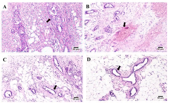 (A–D): Photomicrographs, showing some histopathological appraisals detected in the mammary gland tissues from six treatment groups (arrows). (A) G1 sample showing intense inflammatory cell infiltration with the existence of proliferating neoplastic cells in the mammary ducts, (B) G2 sample showing hemorrhage and edema in the tissue surrounding the mammary tissue, (C) G3 sample showing few proliferating mammary ducts and inflammatory cells infiltration, and (D) G4 sample showing few neoplastic cells forming ducts with mild inflammatory edema, after being treated with the proposed hydrogel incorporating the drug mixture. The fixed samples were processed for the usual histological procedures of the hematoxylin and eosin 100× (H and E) counter staining of ultra-thin paraffin sections (5 µm; Micro HM 360® Microtome).