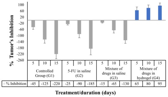 Thus, the changes in a tumor volume in rats were determined every 5 days for 15 days after administration of the injectable medicated hydrogel (contains a concentration of 100 and 40 mg/kg, respectively, for 5-FU and MTX). The antitumor effect was monitored via measuring both the relative tumor volume (RTV), representing the tumor volume after treatment, using Equation (3) [,].
