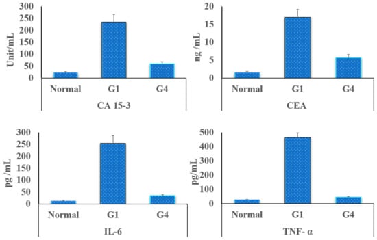 The serological examination, of the induced cancer markers in the rats’ blood, was performed depending on the quantitative determination of both CA and CEA. A CA marker was measured to realize the presence of breast cancer, while CEA indicated the progression of this cancer to other rat tissue or organs. Figure 7 listed the recorded data of both two tumor markers (CA and CEA), for all tested grouped members (n = 6) after two weeks of treatment. The results indicated that both the investigated parameters are high in G1 (the controlled group; cancer-bearing rats), which showed a higher level (12 folds) of tumor markers when compared with the normal rats, while the values of these two tumor parameters were reduced significantly (p < 0.05) in all the treated grouped rats’ samples. Additionally, the levels of TNF-α and IL-6 were elevated in the control group, which received no medication, while their levels were reduced significantly (p < 0.05) after injection of the modified hydrogel loaded with antitumor mixture (G4). These obtained data are in a good agreement with the previously obtained histopathological data, which showed the reduction in swelling and inflammation accompanying the tumor proliferation.