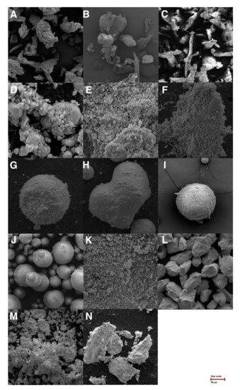 SEM images of cellulose derivatives (A–C), silica and silicates (D–L), and clay minerals (M–N) are visible in Figure 1. In the case of cellulose derivatives, Avicel® PH 101 was observed in particular as cellulose microcrystals are packed tightly in the fiber direction in a compact structure resembling bundles of wooden matchsticks placed side by side [45]. The manufacturer indicates that Methocel® K100LV contains longer, more fibrous particles than Methocel® E4M [38]. This statement was confirmed in Figure 1 and using a measurement by laser diffraction where we measured mean particle size for Methocel® E4M (27.71 µm) and Methocel® K100LV (82.90 µm).