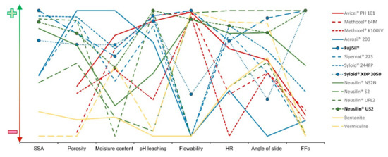 Span represents an important parameter that expresses the width of the particle size distribution (the lower its value, the narrower the particle size distribution) [25]. The values of the measured materials ranged from 0.38 (Bentonite) to 2.14 (Neusilin® NS2N) (Table 1). Samples of cellulose derivatives (Avicel® PH 101 1.45, Methocel® E4M 1.51), silicas, and silicates (Aerosil® 200 1.54, Neusilin® UFL2 1.26, Neusilin US2 1.42, Sipernat® 22S 1.51, Syloid® 244FP 0.82, Syloid® XDP 3050 1.34), and clay minerals (Bentonite 0.38, Vermiculite 1.24) showed relatively low values of the span, indicating that the particles had uniform size [35]. Samples with higher values of the span as cellulose derivative (Methocel® K100LV 1.75) and silicates (Fujisil® 1.86, Neusilin® NS2N 2.14, Neusilin® S2 2.00) could cause problems during solid dosage form manufacturing due to their size non-uniformity.