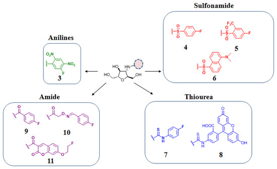 Inhibition constants (Ki) for bicyclic furanose analogs of GLUT5 transport were reported in the 9–32 mM concentration range as measured against [14C]-D-fructose uptake by GLUT5 expressed in CHO cells [27,28,29]. Early studies by Holman and co-workers demonstrated that the presence of hydroxyl groups and their stereochemical configuration on D-fructose derivatives strongly influenced GLUT5-mediated binding and transport [30,31,32,33,34,35]. These structureactivity relationship studies also revealed that hydroxyl groups in positions C-2 and C-6 only play a minor role in binding to GLUT5, rendering these carbons attractive sites for structural modifications in the design of fructose analogs [30,31,32,33,34,35]. As a result, the development of C-6-modified fluorescent and radiolabeled probes of fructose was evaluated in order to study their transport and uptake profiles through GLUT5-expressing breast cancer cells [36,37,38]. However, these probes, which lack a C-6 hydroxyl group, also underwent efflux. This was attributed to their structural unsuitability to undergo metabolic trapping inside the cells through phosphorylation by hexokinase. Removal of the C-2 hemiacetal hydroxyl group in the furanose form of fructose affords the known carbohydrate derivative 2,5-anhydromannitol (2,5-AM), which has an affinity for GLUT5 that was found to be similar to that of fructose [30,31,32,33,34,35,39,40,41]. Conjugates of 2,5-anhydro-mannitol also inhibit fructose uptake through GLUT5. Recently, we estimated an IC50 value against the uptake of the probe 6-[18F]FDF of ~20 mM for 1-deoxy-1-fluoro-2,5-anhydro-mannitol (1-FDAM), substantially better than that for D-fructose itself (~300 mM) [38]. Fluorescent derivative 1-[N-(7-nitrobenz-2-oxa-1,3-diazole-4-yl)amino]-2,5-anhydro-D-mannitol (NBDM) has been shown to be transported twice as efficiently as D-fructose through GLUT5 transporters, as measured in human MCF7 breast cancer cells with a Ki range of 2.3–2.7 mM [42]. We previously examined a series of C-3-modified derivatives of 2,5-AM for their ability to inhibit the uptake of radiolabeled fructose in murine EMT6 mammary-carcinoma cell lines [43]. This study highlighted the importance of the strong hydrogen-bond donor properties of the C-3 substituent; in particular, two electron-deficient anilines and two amides displayed IC50 values comparable to or lower than that of the natural substrate, fructose. The lack of a hemiacetal at C-2 leaves 2,5-AM permanently locked in a furanose form, with a C2 symmetry that renders the C-1 and C-6 hydroxyl groups equivalent and potentially subject to phosphorylation at either site by hexokinase or ketohexokinase (fructokinase). If a reporter group could be attached via C-3 or C-4, the efflux issues noted with fructose derivatives modified at C-6 might be overcome.