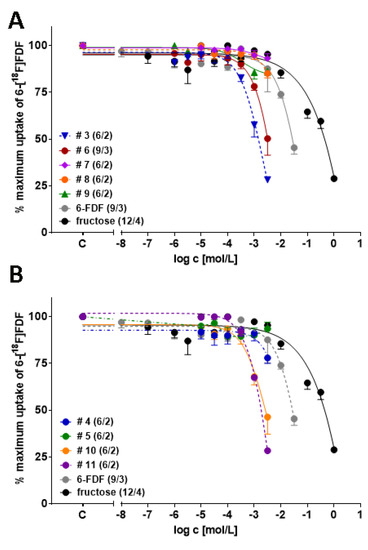 Figure 2. (A) Concentration-dependent inhibition of 6[18F]FDF uptake into EMT6 cells of C-3-modified 2,5-AM compounds (3, 6, 7, 8, 9, 11, 6-FDF and fructose) (B) Concentration-dependent inhibition of 6[18F]FDF uptake into EMT6 cells of C-3-modified 2,5-AM compounds (4, 5, 10, 11, 6-FDF and fructose). Data are shown as mean ± SEM of n data points from 2 to 4 experiments. “#” represents compound number.