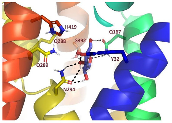 Figure 3. Docking pose and putative interactions of fructose with GLUT5. (Hydrogen bonds are shown as black dotted lines).