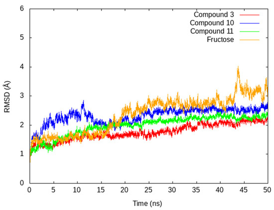 Figure 4. Root mean square deviations (RMSD) of ligandGLUT5 complex systems as a function of simulation time.