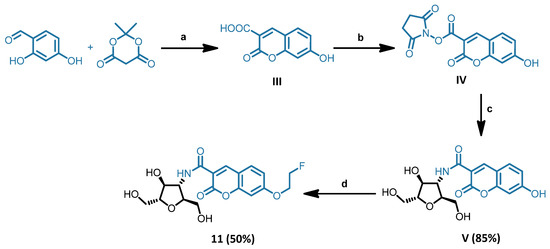 Compound V (0.19 g, 0.57 mmol) and DMF (15 mL) were stirred until completely dissolved in a 50 mL round-bottomed flask, maintained under N2 atmosphere. K2CO3 (0.12g, 0.85 mmol) was then added to the flask, followed by the addition of 2-fluoro ethyl tosylate (prepared using reported procedure [49], 0.375 g, 1.7 mmol), and the resulting mixture was heated at 110 °C for 1 h. After this time, solids were filtered off and the filtrate was then concentrated under reduced pressure. The resultant crude compound was subjected to silica gel column chromatography eluted with a DCM/MeOH solvent mixture (gradient from 100:0 to 95:5). Fractions containing the desired product were combined and concentrated under vacuum to yield yellow oil 11 (0.11 g, 50%). Rf 0.65 (DCM/MeOH, 90:10); [α]D20 + 10.20 (c 0.05, MeOH); IR (cast film) ύ = 3332, 2919, 1710, 1616, 1601, 1561, 1454, 1370, 1226, 1149, 1062, 912 cm−1; 1H NMR (700 MHz, D2O): δ 8.72 (s, 1H), 7.75 (d, J = 8.7 Hz, 1H), 7.08 (dd, J = 8.8, 2.3 Hz, 1H), 7.03 (s, 1H), 4.89 (dt, J = 47.5, 3.7 Hz, 2H), 4.52 (t, J = 7.2 Hz, 1H), 4.49–4.40 (m, 2H), 4.36 (t, J = 7.0 Hz, 1H), 4.13 (ddd, J = 8.2, 5.4, 3.0 Hz, 1H), 4.05 (ddd, J = 7.9, 5.4, 2.6 Hz, 1H), 3.86 (dd, J = 12.3, 2.8 Hz, 1H), 3.83 (dd, J = 12.4, 3.1 Hz, 1H), 3.77 (t, J = 5.0 Hz, 1H), 3.75 (d, J = 4.4 Hz, 1H); 13C NMR (176 MHz, D2O): δ 165.7, 164.1, 162.8, 158.1, 149.6, 132.7, 115.6, 115.3, 113.9, 102.0, 85.6, 84.4, 82.7 (d, J = 169.7 Hz), 77.4, 69.5 (d, J = 19.8 Hz), 63.8, 63.0, 60.1; HRMS (ESI) calculated for C18H20FNO8Na [M+Na]+ 420.1065; found 420.1069, HPLC purity > 99%.