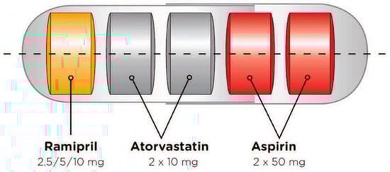 The Fuster-CNIC-Ferrer CV Polypill as a multi-layered formulation, housed in a capsule, was developed using a technology patented by Ferrer [13]. Ferrer scientists began work on the polypill in 2007, and the first pill was launched in 2014. The cardiovascular polypill consists of aspirin (100 mg), ramipril (2.5, 5, or 10 mg), and atorvastatin (20 mg) in a capsule. Studies have demonstrated that treating with polypills in patients with established cardiovascular disease reduces mortality [4,12]. The technology successfully avoids the physicochemical incompatibilities of the individual components and conserves their biopharmaceutical and pharmacokinetic properties (Figure 2).
