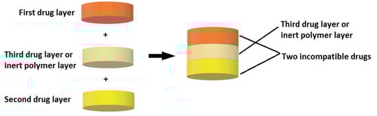 Multilayer tablets represent a new era in developing innovative controlled release formulations with different functions for efficient drug delivery (Figure 5). Bilayer tablets can be a crucial option for avoiding chemical incompatibilities between active pharmaceutical ingredients (APIs) by physically separating them and facilitating different drug release profiles. Many pharmaceutical substances are incompatible with each other, but in the case of multilayer tablets, formulators can insert an inert barrier layer between incompatible matrices to prevent interactions. The multilayer tablet is suitable for the chronological release of two drugs from one pharmaceutical form and for obtaining a sustained drug release where, e.g., one layer serves as an immediate release as a loading dose, and the other layer gradually releases the maintenance dose. The use of bilayer tablets is an utterly innovative aspect in the case of antihypertensive, anti-diabetic, anti-inflammatory, or analgesic drugs, in which combination therapy is often used. Pharmaceutical companies are currently developing bilayer tablets for various reasons, such as improving the effectiveness of therapy, patent extension, or marketing purposes (Table 4).
