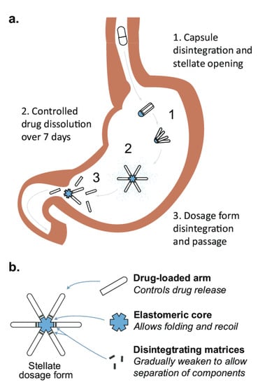 In the 1980s, Cargill et al., demonstrated, for the first time, a consistent 24 h gastric retention of oral dosage forms with the release controlled by erosion in a beagle dog [55]. This design used a decomposable tetrahedral dosage form composed of erodible polymers. The tetrahedral dosage form passes from the stomach in about 12 h in humans.