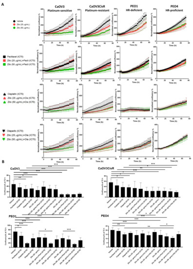 The half-maximal inhibitory concentration (IC50) for cisplatin (#S1166, Selleck Chemicals, Houston, TX, USA), paclitaxel (#S1150, Selleck Chemicals, Houston, TX, USA) and the PARP inhibitor Olaparib (S1060, Selleck Chemicals, Houston, TX, USA) in each cell line at 72 h was determined using the cell counting kit 8 (CCK-8, Sigma-Aldrich, Burlington, MA, USA). Zilovertamab was provided by Oncternal Therapeutics (San Diego, CA, USA). Cells were treated with a vehicle control or zilovertamab at 25 µg/mL or 50 µg/mL for 4 h prior to the addition of the chemotherapeutic agents at IC70 concentration. The effect of zilovertamab +/− agents was investigated using the IncuCyte S3 Live Cell Analysis System. Phase contrast cell images were obtained using a 10× objective lens within the instrument every 3 h for 72 h in total. The average confluence of each well was calculated and normalised against the baseline (time 0 after chemotherapy drugs were added).
