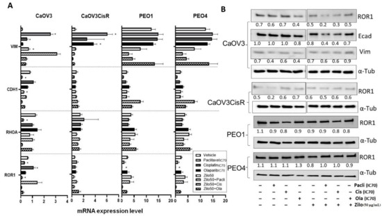 Real-time reverse transcription PCR and Western blot analysis following zilovertamab (“zilo”) +/− Paclitaxel, Cisplatin, Olaparib treatment in high-grade serous ovarian cancer cell lines CaOV3, CaOV3CisR, PEO1 and PEO4. (A). The relative mRNA level of ROR1, CDH1, RHOA and VIM following 72 h treatment. * Significant at p < 0.05 compared with vehicle. (B). Protein level of ROR1 following 72 h treatment as measured by Western blot (representative image). The numbers below each lane represent ratios of band intensity of protein versus α-Tubulin, calculated with ImageJ [16].
