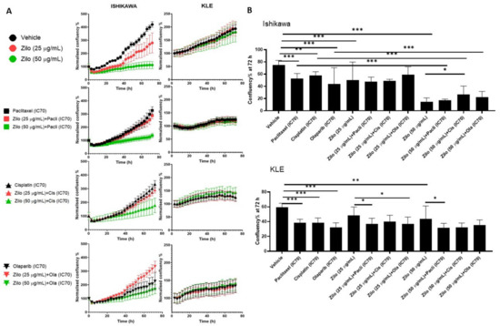 The effect of zilovertamab (“zilo”) +/− Paclitaxel, Cisplatin, Olaparib at IC70 on endometrial cancer cell lines Ishikawa and KLE. (A). Confluency of cell lines over 72 h of treatments analysed by IncuCyte S3. (B). Differences in cell confluency following each treatment compared with control (vehicle for single treatment, single arm for combined therapies) at 72 h. Significance of the comparisons was assessed using two-way ANOVA with a Dunnett/Tukey correction for multiple comparisons. * Adjusted p < 0.05 ** Adjusted p < 0.01, *** Adjusted p < 0.001. For each panel, n = 5, error bar = SEM.