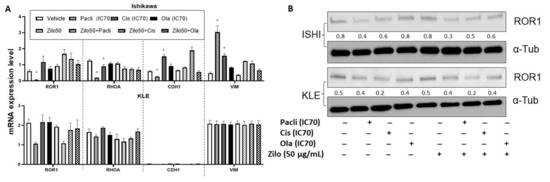Real-time reverse transcription PCR and Western blot analysis following zilovertamab (“zilo”) +/− Paclitaxel, Cisplatin, Olaparib treatment in endometrial cancer cell lines Ishikawa and KLE. (A). The relative mRNA level of ROR1, RHOA, CDH1 and VIM following the treatments indicated by the qRT-PCR result. * Significant at p < 0.05 compared with the vehicle. (B). Protein level of ROR1 following the treatments indicated by Western blot. The numbers below each lane represent ratios of band intensity of protein versus α-Tubulin calculated with ImageJ [16].