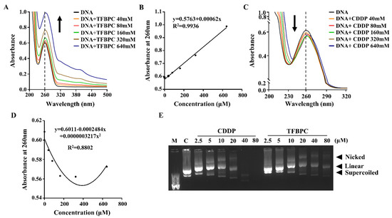 The binding of the platinum-based agent with calf thymus DNA (ct-DNA) was assessed using UV-visible spectroscopy. In total, 1000 ng of ct-DNA (Sigma-Aldrich, Burlington, VT, USA) was incubated with 20, 40, 80, 160, 320 and 640 μM of CDDP or TFBPC in 80 μL ddH2O for 5 h at 37 °C. Absorption between the wavelengths of 220 nm and 500 nm was detected by measuring absorbance every 2 nm via Thermo Varioskan Flash microplate reader (Thermo Fisher Scientific Inc., Waltham, MA, USA). The maximal absorbance of DNA at 260 nm was marked to highlight the spectrum in pure DNA without chemical intercalation.