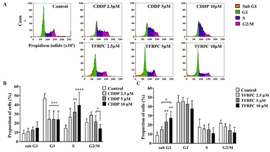 TFBPC and CDDP induced different routes of cell cycle arrest in MDA-MB-231 human breast cancer cells. After MDA-MB-231 cell incubation in 2.5, 5 and 10 μM of CDDP or TFBPC for 24 h, cells were fixed and stained using propidium iodide to detect the DNA content using flow cytometry (A). Proportions of cells at four stages, sub G1, G1, S and G2/M were evaluated using Kaluza Analysis Software and represented as mean ± SD in bar graphs (B,C). * p < 0.05; ** p < 0.01; *** p < 0.001; **** p < 0.0001.