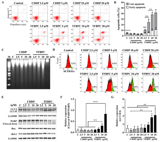 Based on the evidence of combined TFBPC-mediated antiproliferation and cell cycle arrest, we speculated TFBPC may initiate a cell death program. To detect the apoptotic cells, FITC-conjugated Annexin V staining plus flow cytometry was applied. This revealed that CDDP failed to induce MDA-MB-231 cells to undergo apoptosis, as depicted in Figure 4A,C. However, it clearly showed that TFBPC caused cells to undergo an apoptotic fate, as depicted in Figure 4A, and TFBPC-induced apoptosis of MDA-MB-231 was in a concentration-dependent manner as seen in Figure 4B. Furthermore, DNA fragmentation confirms TFBPC-induced apoptosis of MDA-MB-231 (Figure 4C). Considering the central roles of reactive oxygen species (ROS) in apoptosis induction, the assessment of ROS detection was performed, and the results revealed an apparent increase in ROS production from cells exposed to TFBPC (Figure 4D). To determine the molecular mechanisms associated with TFBPC-induced cell death, apoptotic and autophagy markers were characterized and investigated using Western blotting (Figure 4E). The results revealed LC3 I conversion to LC3 II (a typical autophagy marker) (Figure 4G) and the formation of the cleaved form of PARP (Poly [ADP-ribose] polymerase 1) (Figure 4F) plus an increase in Bax/Bcl-2 ratio (apoptotic markers), suggesting that TFBPC induced ROS production coupled with autophagy and apoptotic cell stress.