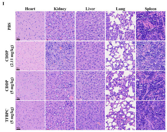 In addition, TFBPC-induced toxicity and side effects were also explored in this study to evaluate possible detrimental effects. To compare a comprehensive picture of the microanatomy of organs and tissues between samples without or with various treatments, the major organs, such as heart, kidneys, liver, lungs and spleen, were acquired from sacrificed animals for the subsequent process of HE staining. No obvious pathophysiological changes or increased numbers of infiltrated leukocytes were observed in all biopsy samples (Figure 5I).