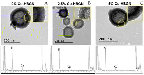The nanoparticles were physicochemically characterized. TEM analysis allowed us to verify their nanostructure and EDS to find out if the copper ions were incorporated into the glass structure. The TEM micrographs depicted in Figure 1 show non-aggregated hollow nanospheres with a diameter of 190 ± 65 nm. Table 2 includes the values for each case showing that no significant differences were observed between the sizes obtained from the different compositions. As can be seen in the figure, HBGN are compartmentalized in what is known as “core” and “shell” nanostructures. The images show that the core occupies between 60–70% of the size of the nanoparticles. Moreover, radial pores can be observed in the shell, the formation of which was attributed to the use of CTAB in their syntheses whereas the core was formed by the presence of the second surfactant, that is, PS-b-PAA.