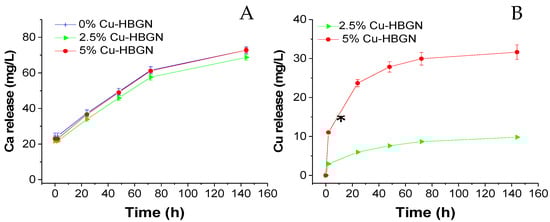 Cumulative release of calcium (A) and copper (B) from HBGN up to 6 d soaked in α-MEM. Data standardized to a release of 1 mg/mL of HBGN. * Significant differences between 2.5 and 5% Cu-HBGN (p < 0.05).