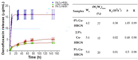 where Wt/W0 is the percentage of antibiotic released at time t and k1, the release constant. δ values are 1 for first-order kinetic material. δ gives an approximation of the degree of fidelity of the proposed model to the theoretical first-order kinetic. The release profile of danofloxacin from the 0% Cu-HBGN composition was characterized by a rapid release in the first 8 h. After 24 h, a slower and sustained release is observed until 3 d, at which time the amount of danofloxacin released decreased considerably, reaching a maximum value of 16 µg/mL. Figure 4 shows that this release represented 77% of the total amount of danofloxacin loaded, which means that another 23% remained, hypothetically, inside the core of the nanoparticles. These data corroborate those obtained by Li [21], in which a two-step release is described: a rapid and abrupt release from the radial pore of the shell, and a slow and sustained release from the core.