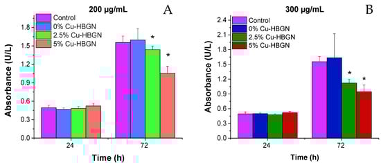 The proliferation of pre-osteoblasts 24 h after exposure to 200 and 300 µg/mL of all compositions was similar to that obtained by cells cultured in the absence of HBGN (Figure 5). However, this proliferation significantly decreased after exposure to all the copper-enriched compositions over 72 h, the reduction being greater in pre-osteoblasts cultured with the higher concentration of Cu-HBGN samples. These results indicate that the decreased proliferation is more closely related to the total amount of copper than to the HBGN per se, as the proliferation values of pre-osteoblasts exposed to 200 µg/mL of the 5% Cu-HBGN sample were similar to those obtained when exposed to 300 µg/mL of the 2.5% Cu-HBGN sample. These values indicate that the synthesized HBGN are cytocompatible and useful for our proposal.
