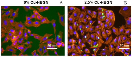Representative images of 0% (A) and 2.5% Cu-HBGN (B) internalized inside MC3T3-E1 cells. The cytoskeleton of the cells is seen in red, the cell nucleus in blue and the FTIC-labelled HBGN in green.