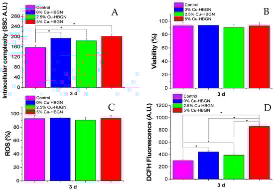 In this study, we quantitatively evaluated the incorporation of HBGN by MC3T3-E1 pre-osteoblasts by means of flow cytometry. This method is widely used to evaluate the incorporation of nanomaterials by mammalian cells through the evaluation of changes in the flow cytometric side-scatter intensity. Figure 7A shows the internal complexity of the pre-osteoblasts after exposure to the HBGN samples for 3 d. In flow cytometry, light scattering at a 90° dispersion angle is called side-scatter light (SSC), determined in part by the cellular cytoplasm, mitochondria, and pinocytic vesicles [79], phagocytosis of foreign bodies as well as the internalization of nanoparticles [80,81], its intensity being proportional to the intracellular complexity. The results revealed significant differences in the SSC parameters of pre-osteoblasts when exposed to the different HBGN samples with respect to those shown by control cells. However, no significant differences were observed between the different compositions. These results confirm the internalization of all HBGN compositions, and it is concluded that the internalization of the HBGN is independent of the atomic percentage of Cu doped in the material, as had already been observed in the internalization of the FTIC-labelled HBGN (Figure 6). In view of the results, it can be hypothesized that the following results obtained are mainly due to the degradation of the HBGN inside cells. Cell viability is an important biological parameter related to the integrity of the cell membrane, which allows the evaluation of the biocompatibility of the nanomaterials. In fact, the interaction of HBGN with cell membranes has been reported as one of the major causes of their cytotoxicity. Figure 7B shows the viability of the cells and as can be seen, there are no significant differences in the cell viability of pre-osteoblast after exposure to the different HBGN samples with respect to the control cells or between the different HBGN, so that the exposure of HBGN to a concentration of 50 µg/mL for 3 d does not affect viability in the MC3T3-E1 cell line. These results do not conflict with those obtained using MTS, since they served to establish the limits of the concentration to which this cell line could be exposed without leading to a drastic decrease in proliferation, while this test aims to see the effect of long-term viability without removing the HBGN from the well at a lower concentration.