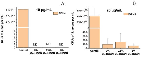 Results obtained from the bacterial growth inhibition test in the planktonic state using (A) 10 μg/mL of HBGN against E. coli and (B) 20 μg/mL of HBGN against S. aureus. Non-detected CFUs are marked as ND.