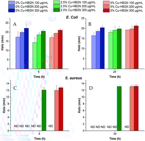 Inhibition halos obtained from the contact of HBGN loaded with danofloxacin, at different concentrations, times, and bacterial species: (A) E. coli at 6 h, (B) E. coli at 24 h, (C) S. aureus at 6 h and (D) S. aureus at 24 h. Non-detected halos are marked as ND.