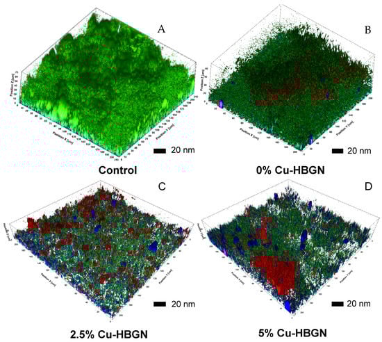 Measures of 2 × 108 CFUs/mL of S. aureus were seeded in 12-well plates with a circular glass slide and cultured with THB enriched with 4% sucrose at 37 °C under shaking (100 rpm) for 24 h. Afterwards, this medium was replaced with fresh medium without sucrose and it was kept for another 24 h until the biofilm was obtained. The slides with the biofilm were transferred to 12-well plates with transwell and 200 µg/mL of the three danofloxacin-loaded HBGN compositions. After 24 h of incubation with shaking at 37 °C, the biofilms were extracted and stained using the BacLight bacterial viability kit (Thermo Fisher Scientific, Invitrogen, Waltham, MA, USA). Images were obtained by means of an OLYMPUS FV1200 laser confocal microscope (OLYMPUS, Tokyo, Japan), using 60× FLUOR immersion lenses in water (NA = 1.0). The micrographs were obtained using the 3D Imaris software that was used to convert each of the 2D images into 3D micrographs, using the Z sections and an algorithm that shows the maximum pixel value of each 1 mm Z cut. Live bacteria were observed in green (SYTO 9), dead ones in red (PI) and the biofilm matrix in blue (Calcofluor).
