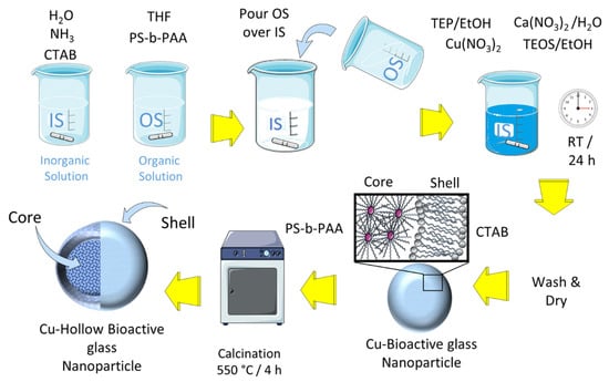 Three HBGN compositions were synthesized with increasing amounts of copper within the 79.5SiO2-(18-x) CaO-2.5P2O5-xCuO (x = 0, 2.5, 5 mol-% CuO) system using the protocol described by Li et al. [21]. This methodology consists of preparing an emulsion of an organic/aqueous solution in which two structure directing agents are dissolved: CTAB and PS-b-PAA of an average molecular weight, Mn 38,000 Da, 20 wt-% PAA. On the one hand, an inorganic solution (IS) was prepared by dissolving CTAB and concentrated NH3 in distilled water, while in another container an organic solution (OS) was prepared by dissolving PS-b-PAA in tetrahydrofuran (THF), keeping both mixtures under stirring at 37 °C for 30 min to later pour, abruptly, the OS over the IS, leaving it under stirring for 20 min. Subsequently, the appropriate amounts of triethyl phosphate (TEP), Ca(NO3)2·4H2O, Cu(NO3)2·2.5H2O and tetraethyl orthosilicate (TEOS), previously dissolved in ethanol, for TEP and TEOS, or water, for Ca(NO3)2·4H2O, were added sequentially and spaced in time by 20 min. The mixture was kept stirring for 24 h at 37 °C and covered with Parafilm to avoid evaporation. The resulting product was centrifuged at 12,000 rpm for 12 min at 4 °C and washed once with H2O and twice with H2O/ethanol (50%). After 24 h of drying at 30 °C, the samples were calcined 4 h at 550 °C using a ramp of 1 °C/m. The steps carried out during the synthesis process are shown in Scheme 1 and the amounts of reactants used are shown in Table 1. All reagents were purchased from Sigma-Aldrich, St. Louis, MO, USA).
