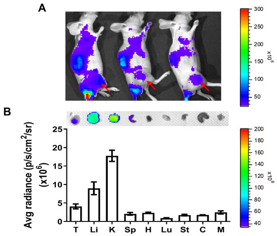 In order to track the tumor targeting of bovine serum albumin–coated gold nanoparticles (GNPs–BSA) in xenografts, GNPs–BSA nanoparticles were first pre-labeled with florescent dye Cy7.5 prior to intravenous tail vein injection into animals, followed by monitoring and tracing frutescence, using IVIS in vivo imaging system. The results revealed that fluorescence intensity appeared on tumors located on the animal’s right thigh and other areas (Figure 1A), suggesting the enhanced permeability and retention effect (EPR effect) induced by GNPs–BSA nanoparticles targeting tumors, but not in a very highly specific mode. GNPs–BSA nanoparticles were also retained in several organs, such as the liver, kidney, spleen, heart, lung, stomach, colon, and muscle from sacrificed animals (Figure 1B). Higher fluorescent intensity was detected and observed in kidney and liver compared to the other organs and tumors. Detoxification in the liver and urinary excretion in the kidney may contribute to the increased retentions of GNPs–BSA in these two major organs.