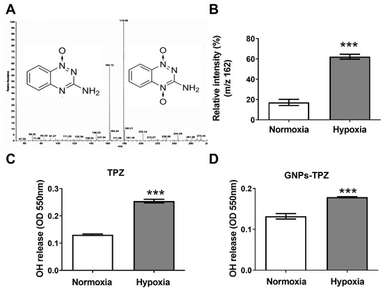 Tirapazamine (TPZ) is one of the hypoxic cytotoxins that selectively act in hypoxic tumor cells through bioreductive mechanisms. One-electron (1e−) reduction of TPZ by reductases leads to the formation of TPZ radical and may undergo homolytic cleavage to form the toxic species hydroxyl oxidizing radical (•OH) under hypoxia condition. Alternatively, TPZ can metabolically convert to oxidizing benzotriazinyl radical (BTZ). Both TPZ- and BTZ- radicals are DNA-damaging species and lead to the death of cells under a hypoxia environment. Hydroxyl oxidizing radicals give rise to the cytotoxic effects of cells resulting from DNA double-strand break (DSB), at least partially, associated with the topoisomerase-II dependent process [36,37]. In contrast to the hypoxia condition, the TPZ radicals are able to re-oxidize back to the original compound coupled with the production of a superoxide radical (O2−) if oxygen is present. To quantify and compare the amount of hydroxyl radical (•OH) released from TPZ either under hypoxic or normal (normoxia) conditions, 1 mg/mL of TPZ dissolved in PBS buffer was incubated at normoxia or anaerobic conditions (hypoxia), driven by an AnaeroPack system for producing •OH. (Figure 3A) The •OH release was detected by using an LTQ Orbitrap mass spectrometer by observing the structural exchange of TPZ from m/z 179 to m/z 162, which indicated that an •OH escaped from TPZ. The relative intensity of m/z 162 to m/z 179 in hypoxia significantly increased compared to that in normoxia. The •OH levels measured at OD 550 nm were also significantly elevated in hypoxia compared to that in normoxia (Figure 3B,C). Moreover, the value of OD 550 nm was increased in the GNPs–TPZ incubated in the hypoxia condition (Figure 3D). The results indicate that TPZ released a significantly higher amount of •OH under anaerobic conditions.