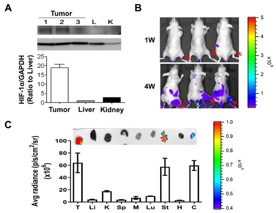 Hypoxia-inducible factors (HIFs) are transcription factors regulated by oxygen-dependent dioxygenases and act as the primary oxygen sensors, contributing to a broad, adaptive response to hypoxia. HIF-1α is the hypoxia-response regulator of cells and is involved in the expressions of different genes for adapting to insufficient oxygen availability [38]. In response to growth factors, HIF-1α can be upregulated with increased protein expression levels through the activation of the PI3k/Akt-mTOR signaling pathway [39,40]. In addition, carbonic anhydrase 9 (CA9) is also one of the hypoxia-markers and transcriptionally regulated by HIF-1α. Therefore, we would like to evaluate the expressions of HIF-1α and CA9 on tumors or other organs of MKN45 xenograft mice for determining the hypoxic regions in animals. We imaged and quantified the expressions of CA9 in tumors and organs derived from animals by using Hypoxisense 680 Fluorescent Imaging Agent combined with an IVIS detection system [41]. In addition, the expression of HIF-1α expression, using electrophoresis combined with Western blotting, was assessed on tumor biopsy samples and organs, including lungs and kidneys. It revealed that the HIF-1α protein level in tumors was statistically significantly higher than in organs, including livers and kidneys (Figure 4A). We imaged and quantified the expression of CA9 in tumors at week 1 (1W) and week 4 (4W), demonstrating a significant increase in CA9 expression in 4W tumors (Figure 4B). Besides tumors, CA9 expressions in the stomach and colon were significantly higher than in other organs, such as the liver, kidney, spleen, heart, lung, and muscle (Figure 4C). These results indicated that hypoxic markers, such as HIF-1α and CA9, were highly expressed on the tumors and their expressions were increased with tumor growth, suggesting the presence of hypoxia in tumor tissues and hypoxic degree increased with tumor progression.