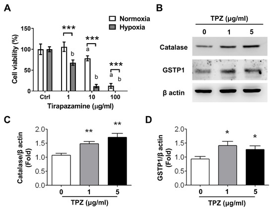 To compare the cell viability of MKN45 gastric cancer cells exposed to TPZ either under normoxia or hypoxia condition, cells first were pre-cultured in a medium containing 1, 10, and 100 μg/mL of TPZ, followed by cell viability assessment, using WST-1 assay. The results indicated that cell viability was significantly reduced in cells treated with TPZ at ≥10 μg/mL under normoxia condition and ≥1 μg/mL under hypoxia condition, suggesting that hypoxia induced the enhanced cytotoxicity of TPZ on MKN45 gastric cancer cells (Figure 5A). An increased expression of catalase and glutathione-S-transferase Pi 1 (GSTP1) in cells exposed to TPZ at 1 and 5 μg/mL under hypoxia conditions was detected by using Western blots (Figure 5B). The quantification of increased catalase and GSTP1 from MKN45 cells treated with 1 or 5 μg/mL under hypoxia conditions is depicted in Figure 5C,D, respectively. GSTP1 belongs to the family of glutathione S-transferases (GSTs) with the enzymatic activity on detoxification [42]. Catalase is an antioxidant enzyme in all aerobic organisms to catalyze hydrogen peroxide into oxygen and water.