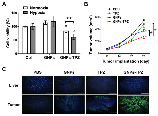 GNPs–TPZ treatment contributed to the reduction of MKN45 cell viability and tumor volume of MKN45 tumor-bearing xenografts. A significant reduction in cell viability of MKN45 cells cultured in medium containing GNPs–TPZ under hypoxia for 48 h compared to in normoxia (A). Cell viability was assessed by using WST-1 assay; ** p < 0.01 represented the statistical significance of cells receiving GNPs–TPZ treatment in hypoxia vs. normoxia. The lowercase letter “a” indicates statistical significance compared to control under normoxia, and the “b” indicates statistical significance compared to control under hypoxia. Changes in tumor volume in MKN45 xenografts post-intravenous injection of PBS, TPZ, GNPs, and GNPs–TPZ at the dose of 0.5 mg/kg (n = 3 for each group) for 20 days were monitored and compared. As implanted tumors reached 50 mm3, drug injections were carried out at days 10, 14, and 17 (B); * p < 0.05 represented statistical significance among the labeled groups. Histological apoptosis detections in tumor and liver tissues resected from xenografts post-treated with PBS, Free GNPs, TPZs, and GNPs–TPZ by TUNEL staining. Green, apoptosis DNA; blue, cell nuclei. Scale bar: 100 μm (C).