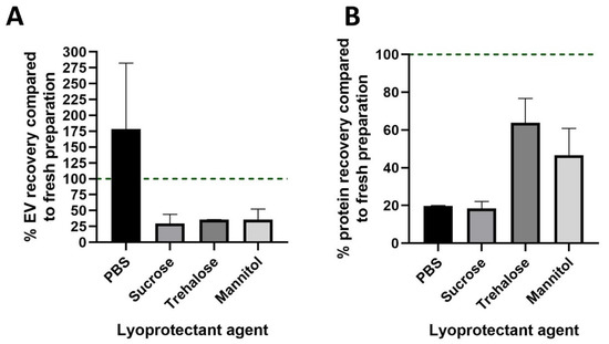 In this study, we assessed the effectiveness of three disaccharide excipients in two lyophilization protocols. With the manifold protocol, rapid temperature reductions could pose significant stressors to the EV and protein constituents. Following manifold freeze drying, the MSC-SP formulated with trehalose had the highest protein recovery and had an EV recovery that was similar to the other SP formulations. Compared to sucrose, trehalose may have a greater ability to disrupt ice crystal formation, and may be a more effective lyoprotectant [43]. Conversely, high levels of protein and EV recovery were observed in all three formulations of MSC-SP prepared with the shelf protocol. The mannitol-formulated SP exhibited the highest EV and protein recoveries. Unlike the manifold protocol, the shelf protocol enables a careful control of the temperature and pressure conditions during each step. As a bulking agent, mannitol may mitigate the mechanical stress associated with sublimation-induced dehydration [44].