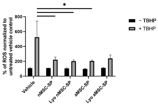 ROS levels were detected using 2′,7′-Dichlorodihydrofluorescein acetate (DCFDA). This is a cell-permeable probe that is non-fluorescent. Once taken up by cells, DCFDA is converted by intracellular esterases and oxidized by intracellular ROS to 2′,7′dichlorofluorescein, which is highly fluorescent. The increase in fluorescence is a sensitive indicator of the presence of ROS. HepG2 cells were seeded onto a black collagen-coated 96-well plate at a concentration of 10,000 cells/well. After an overnight attachment period, the cells were treated with 4% w/v trehalose (vehicle control), 8.00 × 106 particles of fresh or 1.00 × 108 particles of the lyophilized trehalose formulation of MSC-SP. After 24 h, the cells were incubated with 20 µM of DCFDA for 45 min in complete darkness at 37 °C. The media were then removed and replaced either with media or media supplemented with 0.5 mM tert-butyl hydrogen peroxide (TBHP) for 1 h. ROS specific production was quantitated by measuring the fluorescence intensity at an excitation wavelength of 485 nm and emission of 535 nm.