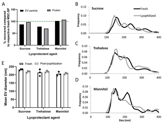 With the advent of new lyophilization technology, we developed and tested a shelf-based lyophilization protocol specifically designed for the preservation of cell-derived trophic factors, including EV and secreted proteins. As before, we prepared three formulations of MSC-SP using lyophilization excipients, 5% sucrose, 4% w/v trehalose and 4% w/v mannitol. The SPs were separated into equal-volume aliquots and one aliquot of each formulation was freeze-dried using the newly developed shelf-based protocol. The MSC-SPs preserved using the shelf-based protocol had markedly higher EV and protein recoveries compared to those prepared with the manifold-based lyophilization protocol (Figure 3A,B). The EV and protein recoveries of the lyophilized MSC-SP were the highest in the samples diafiltrated with sucrose or mannitol (Figure 3A,B and Figure 4A). Differences in the particle size distribution profiles of the fresh and lyophilized secretome were observed; however, the average diameters of the EV were similar (Figure 4B–E; Table 2).