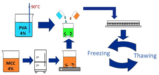 | PVA/MCC-7 | PVA:MCC | 90:10 | Freezing/Thawing 7 cycles |
