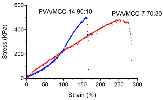 | PVA/MCC-14 | 90:10 | 689.69 ± 55.77 | 356.13 ± 34.86 |