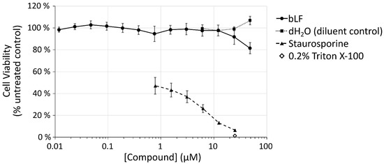In A549 cells, a model cell line for the lower respiratory system, bLF is nontoxic up to 20 µM (Figure 1). Above this, there is a nonsignificant reduction in viability up to 50 µM (p = 0.23). This is in contrast to the control compound staurosporine, that showed a significant drop in viability when incubated with these cells (p < 0.0001).