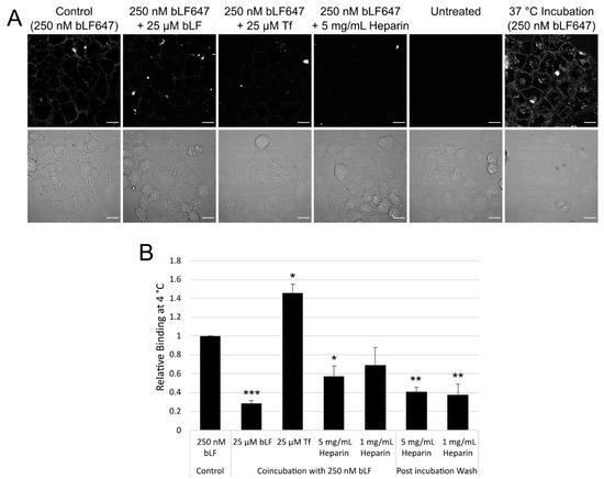 bLF cell binding and competition. Cells were incubated with 250 nM bLF647 in the presence of potential competitors for 1 h at 4 °C before being analysed by confocal microscopy (A) or flow cytometry (B). Scale bar = 50 µm, error bars represent SEM. Flow cytometry represents the mean of three independent experiments performed in duplicate; fluorescence intensity is measured using the median and normalised to the control. Statistical analysis was performed using a one-way ANOVA (F (6, 14) = 17.13, p < 0.0001) with a Dunnett post hoc analysis of control versus samples * p < 0.05, ** p < 0.01, *** p < 0.001.