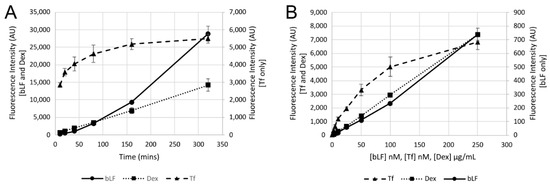 The internalisation properties of bLF647 were compared with transferrin, a model for receptor-mediated endocytosis, and dextran, representing a model for fluid-phase endocytosis. Cells were incubated with bLF647 for different time periods and compared to Tf488 and Dex647 (Figure 3A). Transferrin was rapidly endocytosed into the cells before reaching a steady state after 160 min where uptake and recycling balance each other. Since fluid-phase endocytosis is an ongoing process, and not receptor-dependent, Dex647 endocytosis is a continuous process. Like dextran, bLF647 cell-associated fluorescence increased over the entire time period; however, the kinetic profile was very different. Cell uptake can also be compared as a function of concentration and assays were also conducted with increasing concentrations of the three analysed probes. Here, as in Figure 3B, fluid-phase endocytosis (Dex647) was linear with respect to concentration, while receptor-mediated uptake (Tf488) can be equated to receptor–ligand binding kinetics.