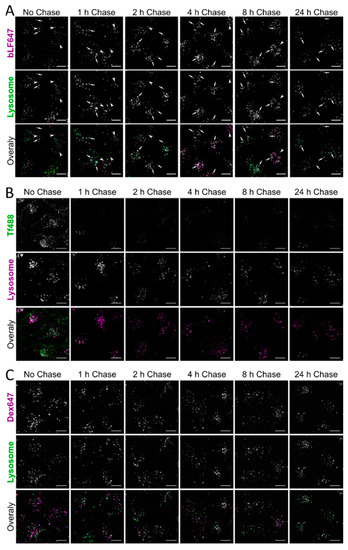 Lactoferrin has been researched as an antiviral and antimicrobial agent; however, little research has been performed on where it localises in the cell once it has been internalised, or whether it persists to potentially act against the pathogen. To determine this, we looked at three complimentary techniques to assess the trafficking properties of bLF: confocal microscopy, flow cytometry, and Western blotting. Both flow cytometry and Western blotting showed a persistence of the bLF647 fluorescence signal up to 24 h, indicating they had not been recycled. This does not however refute the possibility that the fluorophore has become decoupled and continues to provide a signal. This is in contrast to Tf488, where the signal was lost following a 1 h chase period, indicating that rapid recycling had occurred. Dex647 showed a gradual loss of signal to ~50% intensity during the 24 h period, indicating that there was a slow expulsion of the fluorophore. An unexpected increase in fluorescence signal was observed in cells incubated with bLF647 after just a 1 h chase by both confocal microscopy and flow cytometry. The reason for this is unclear, but we hypothesise that this may be due to a dequenching effect of the fluorophore as has been seen previously in our studies using Cy5-mRNA-loaded lipid nanoparticles in one cell line [39] and Alexa488-labelled exosomes [40]. However, Western blot analysis of unlabelled bLF did show that there was a decrease in cell-associated bLF over the first 2 h of chasing. This indicated that the majority of the bLF was degraded in lysosomes in 2 h, rather than being exocytosed, and that the remaining fluorescent signal shown by flow cytometry and confocal microscopy emanated from the fluorophore alone or attached to bLF peptides that could not be detected by Western blotting.
