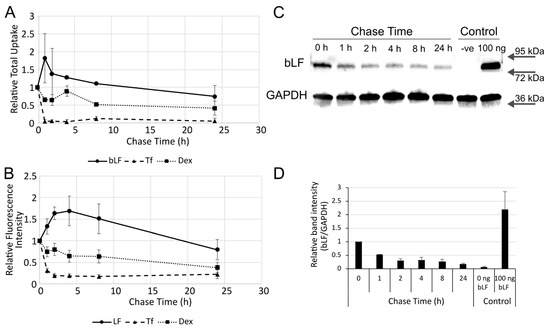 To determine the potential rates of exocytosis/recycling of the internalised bLF647, the same experiments used to generate Figure 4 were performed, but with the fluorescence analysed by flow cytometry (Figure 5B). While Tf488 rapidly recycled out of the cell, there was a slower exocytosis of internalised dextran. Similarly, after a 4 h chase time, there was a slow reduction in fluorescence intensity of internalised bLF647; however, there was an unexpected increase between 0 h and this timepoint. A very similar effect can be seen when quantifying cellular fluorescence in the microscopy images (Figure 5A). Further experiments were performed as above with the collection of cell lysates at different chase timepoints. The lysates were separated by SDS-PAGE, and Western blot analysis was performed to detect bLF. The data showed a rapid reduction in detectable bLF signal over the first 2 h of the experiment, with little subsequent reduction until the 24 h timepoint (Figure 5C,D).