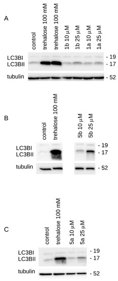 Biological activity of trehalose, conjugates 1a and 1b and NAs 5a and 5b. We assessed LC3B conversion upon compound treatment by Western blotting. (A) Evaluation of autophagy induction in HeLa cells treated for 24 h with trehalose, 1b and 1a. Upon treatment, we analyzed tubulin, LC3BI and II levels by Western blotting. (B) Evaluation of autophagy induction in HeLa cells treated for 24 h with trehalose and 5b. Upon treatment, we analyzed α-tubulin, LC3BI and II levels by Western blotting. (C) Evaluation of autophagy induction in HeLa cells treated for 24 h with trehalose and 5a. Upon treatment, we analyzed α-tubulin, LC3BI and II levels by Western blotting.