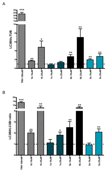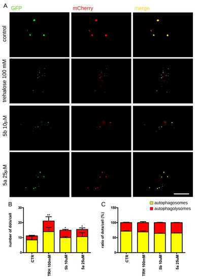 Thus, we treated HeLa cells expressing the GFP-mCherry-LC3B reporter for 24 h with trehalose (positive control) and both NAs at the highest concentration lacking toxic effect, i.e., 10 μM for 5b and 25 μM 5a. We noticed that both 5b and 5a induced a significant increase of the number for both autophagosomes and autophagolysosomes (Figure 5A,B). The treatment did not alter the ratio between autophagosomes and autophagolysosomes, suggesting that it did not cause any gross alteration of the physiological autophagic flux (Figure 5C).